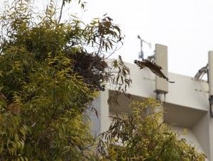 A mother hawk near the Disabilities Services Center takes off from her nest to forage for food.