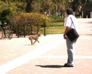 It’s a jungle out there! One of Irvine’s famous bobcats sprints along the road in the biological sciences area.