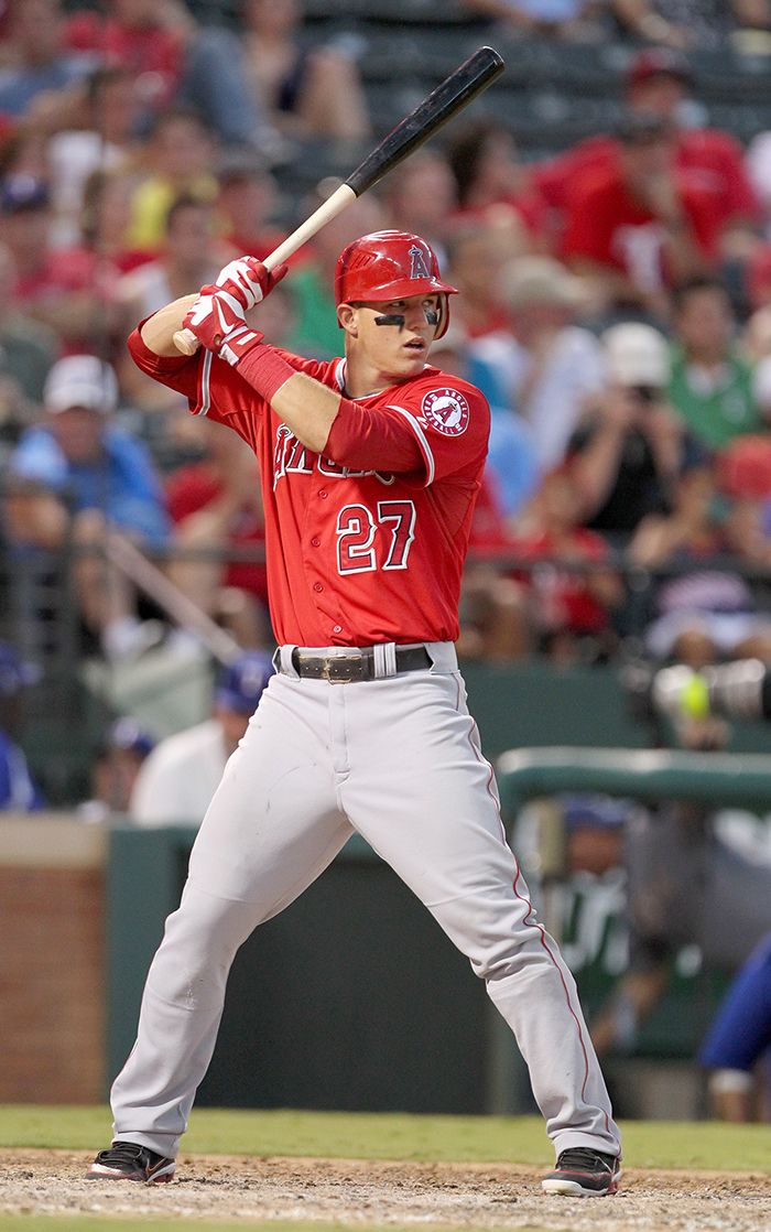 July 30, 2012; Arlington, TX, USA; Los Angeles Angels outfielder Mike Trout (27) at bat in the seventh inning against the Texas Rangers at Rangers Ballpark. Mandatory Credit: Matthew Emmons-US PRESSWIRE