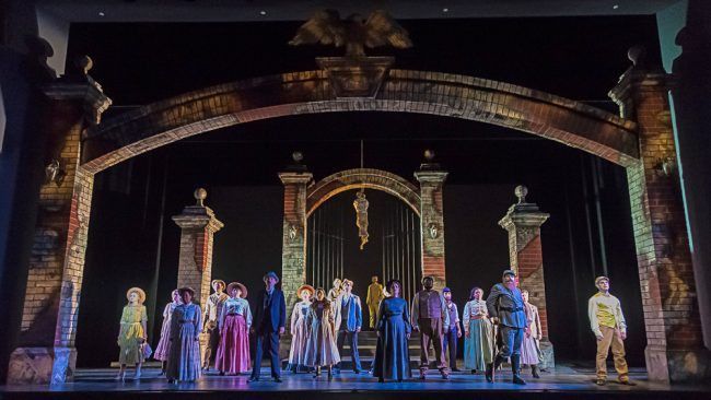 “Parade” excels in its design and music, which combines the tensions of the early 20th century and a South still reeling from the Civil War. The set is burned; shades of red brick, gray ash and black wood recall the burning of Atlanta during General Sherman’s March to the Sea, while the gas and candlelit lanterns harken to an age that was still transitioning to electricity. The costumes call back to a historical era of top hats and elegant gowns, framing the Southern aesthetic that runs throughout the musical. This too, reflects the racial disparity of the white and black citizens of Atlanta, noticeably divided by their economic status. Even the curtain that hides the stage reeks of Americana, as Frederic Edwin Church’s painting “Our Banner in the Sky” vividly portrays the Star-Spangled Banner. Finally, the visage of the hangman’s noose and Frank’s lynching haunts the stage, swinging back and forth like the pendulum of a clock.