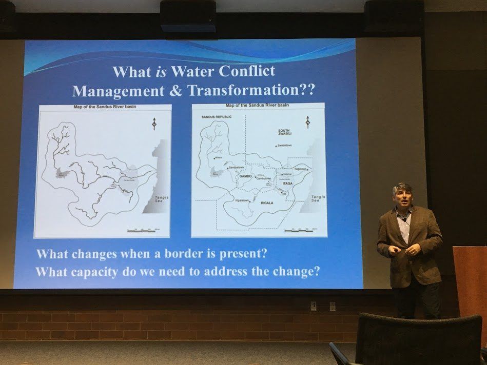 He started his lecture by explaining the definition of water conflict. Throughout the world, shared watersheds are usually not considered geographically, but rather through political boundaries. Water conflicts are often fought between people who live in close proximity but are separated by city-state lines, usually driven by uncoordinated development or internationalized basins. When solving conflicts, Wolf states that “You have to consider both political and also geographical borders.”