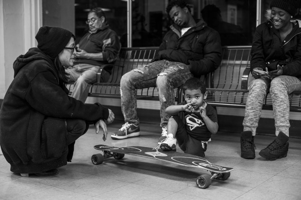 It was around 3 a.m. at a bus station in Glenwood Springs, Colorado. People were tired and cold waiting for their next bus to arrive. A mother watches her son nearby. Her boy is full of energy at this time and finds a new friend in a woman they have never met before. The woman is probably tired of the wait herself, but she doesn’t mind when the boy asks if she could teach him how to ride a skateboard. Together they pass the time until it is time to go their separate ways.