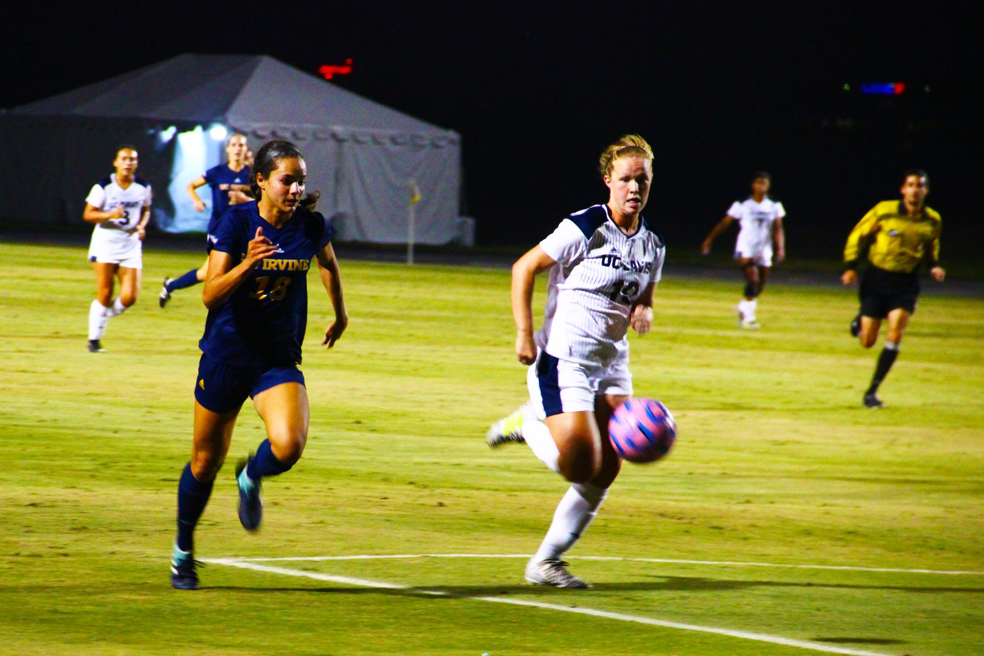 Riverside’s single clean shot attempt did, however, give the ‘Eaters a good scare. Prior to Galbraith’s goal, a Highlander jumped out front to beat the ‘Eaters backline and went one on one with UCI sophomore keeper Maddie Newsom. As she propelled one straight at the nets, Newsom dove and punched it out of play.