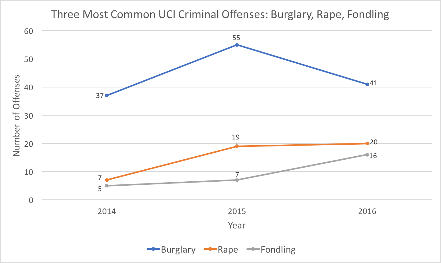 Of the above criminal offenses, burglary, rape and fondling had the highest number of offenses at UCI last year, with 41, 20 and 16 total offenses respectively.