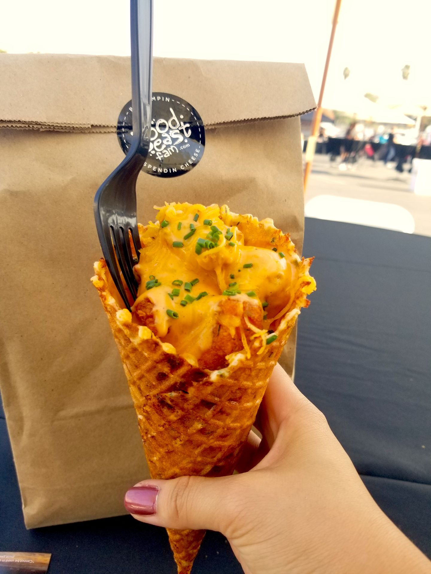 Bruxie, known for its chicken and waffle sandwich, created a seasoned waffle cone filled with spicy buffalo macaroni and cheese and topped with famous spicy fried chicken tenders and buffalo cheese. Now that’s a winner.