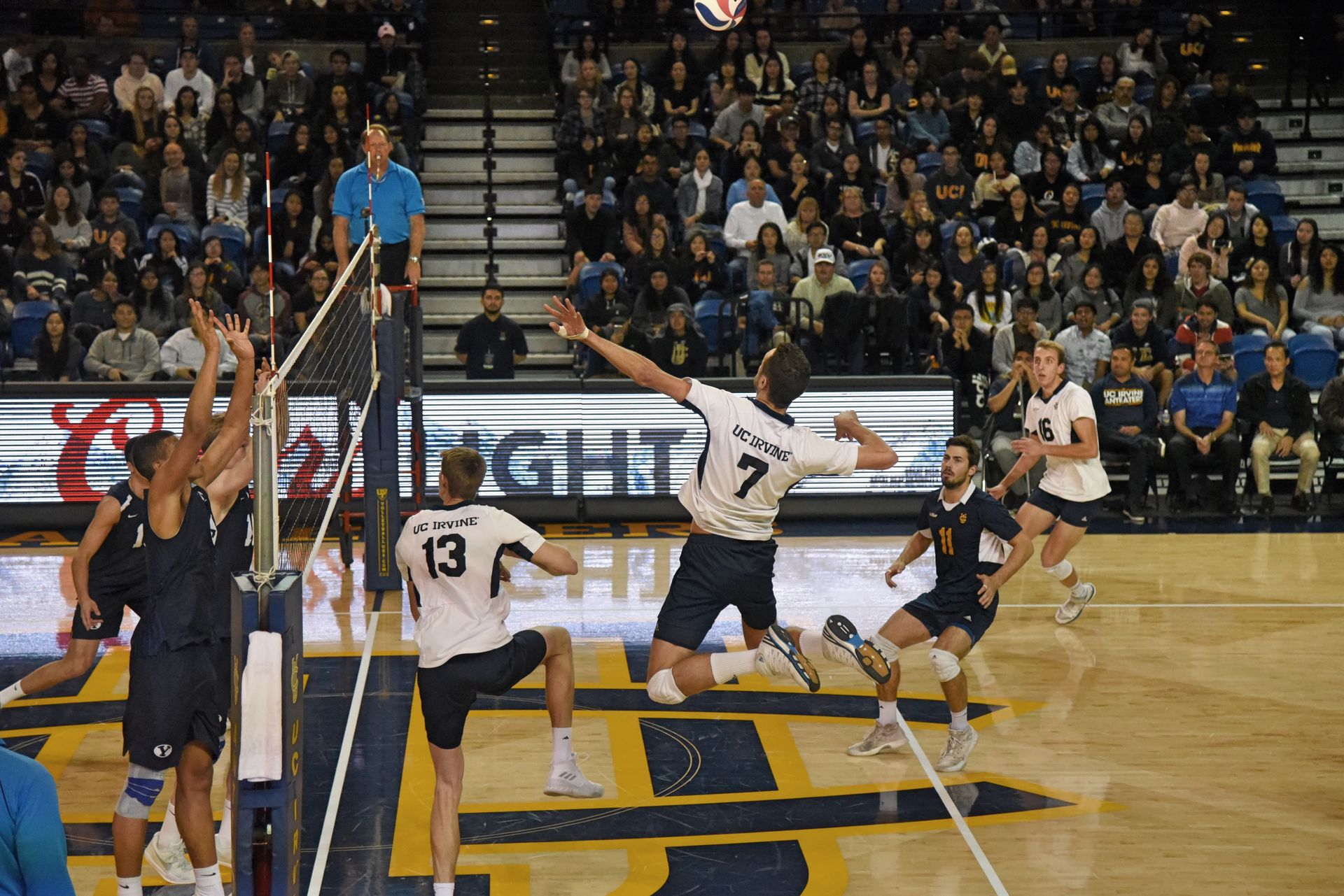 After five sets of electric volleyball, the UCI men defeated their rival BYU Cougars on Saturday night to complete a two game sweep of the fifth ranked Cougars. (25-16, 24-26, 25-18, 21-25, 15-13).