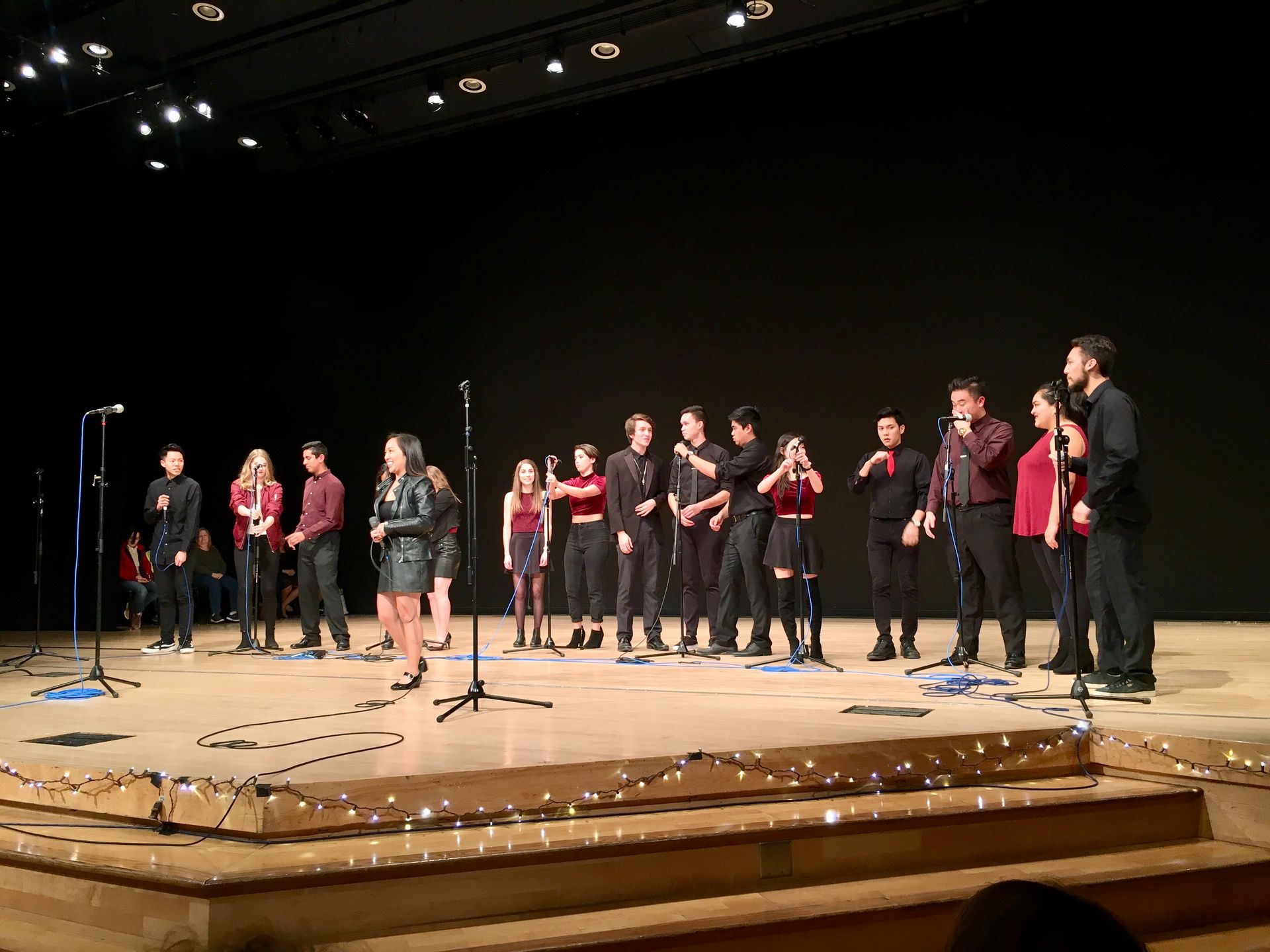 Vermillion Vocalists, a co-ed UCI group formed in 2009, kicked off the evening with a set featuring a solo from Randi Paulos singing “Undercover” and marvelous melodies from the whole group musically directed by Kenai Gonzalez.  Following VeVo, USC’s christian a cappella group  Overflow delivered powerful performances of “The Secret Place” and “God My Rock”  that brought the house down while lifting spirits to  the highest of highs. Next to the stage was the the top choir, UCI’s Chamber Singers conducted by Dr. Houston. Their performance of Chance the Rapper’s “Finish Line” feautured the stylish rapping of Kenai Gonzalez and filled the room with new energy. The UCSD Tritones closed out the first half of the show with a medley of “Say My Name/ “Honeymoon Avenue”, “Jealous”, and “Girl on Fire”.  There’s  a reason the Tritones have won the Los Angeles A Cappella Festival: they’re bona fide professionals.