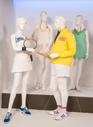 In the exhibit, Billie Jean King’s pristine white dress is juxtaposed with Bobby Rigg’s bright yellow jacket, branded with the words “Sugar Daddy,” an ode to the real life Rigg’s misogynistic and egotistical demeanor. The costumes are an ode to yesteryear, a time of tremendous change and an older generation of feminists (more through circumstance than by choice) whose efforts feel, potentially, even more important today than ever.
