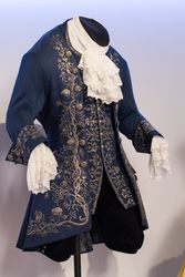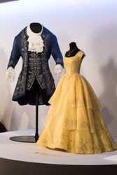 The sheer amount of detail and craftsmanship put into both Belle’s and the Beast’s attire is something rarely seen in the movie, what with the dance scene that is as old and enchanting as time. The bodice of her signature yellow dress was sequined with tiny dots of glitter embroidered into the light taffeta looking material. Looking at it was as magical as spinning and flying about the dance floor as it must have been for Emma Watson — one could just imagine the sequins and sparkles glittering. The details of Belle’s necklace surprised me, as that is one ornament that viewers don’t get to see much detail of in the film. The pendant, a gleaming bronze-gold, is only big enough to fit in the palm of your hand and shaped to look like a vine weaved with flowers and leaves. The chain is a bronze ribbon. I felt like a princess just looking at the costume.