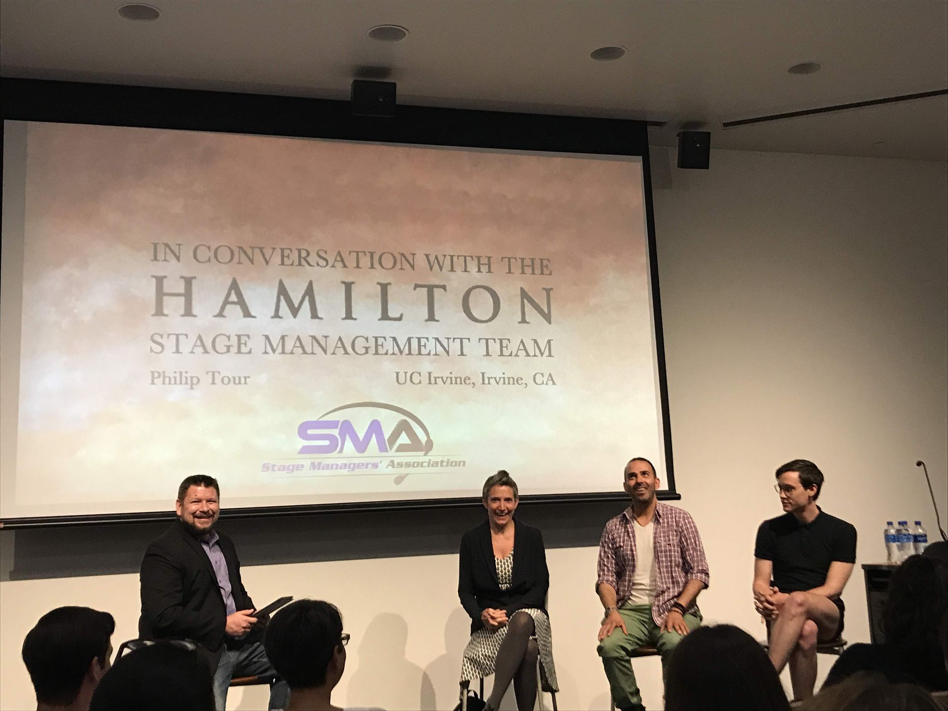 Held in the Contemporary Arts Center at UCI’s Claire Trevor School of the Arts, an audience gathered for the panel of three, moderated by the SMA Western Regional Director Joel Veenstra. He introduced the association and its goals to empower and support stage managers throughout the country. Once each attendee was fully introduced, Veenstra asked the crew what it was like to be working on such a popular and successful show. Kaltenbach and Linares described the “tremendous privilege” of working on the show and being able to witness how “truly impactful” each performance was for its audiences. ASM Kerr discussed how watching the audience was one of his favorite parts of staging a show. SM Linares also brought up the opportunities the cast and crew of the Hamilton tour recieve, based on name recognition and the amazing people they work with. Kerr brought about the moments of revelation he’s witnessed on the many spectators’ faces on show nights or at the stage door.