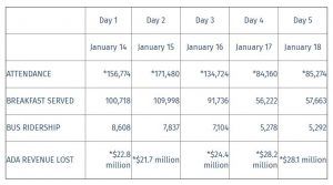 LAUSD attendance and lost revenue over the first five days of the strike. Attendance numbers are subject to change as 18 schools have yet to submit reports.