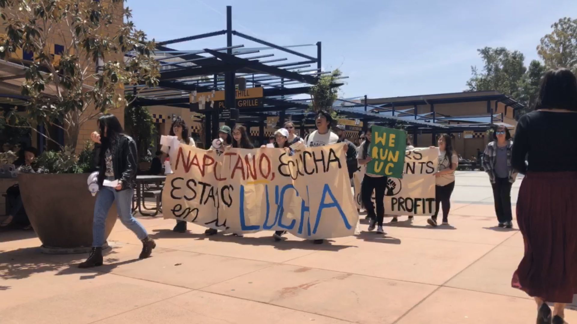 The march began with a walk around the campus through student center and ending near social sciences. As students marched, they also shouted chants such as, “Whose university? Our university!” and “UC, UC, you’re no good, treat your workers like you should!” They concluded by hanging a banner over the bridge to the University Center that read, “Workers and Students Over Profit.”