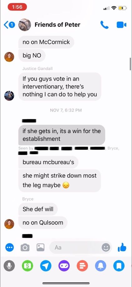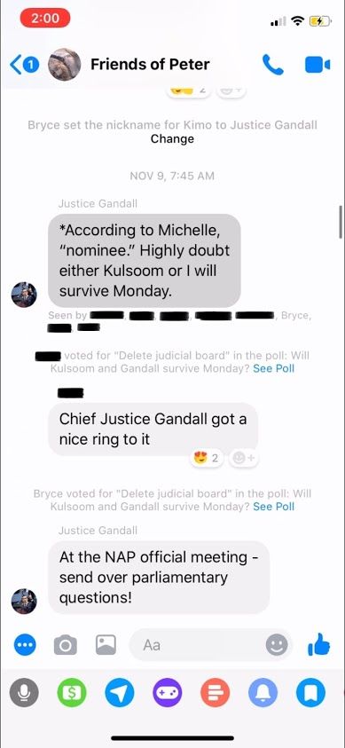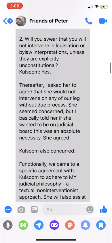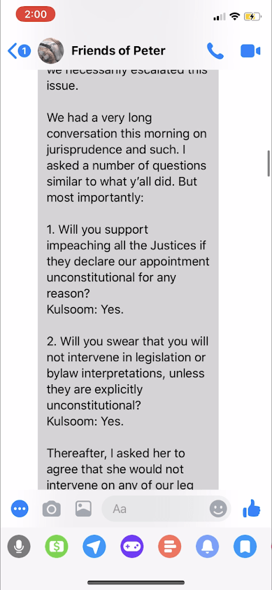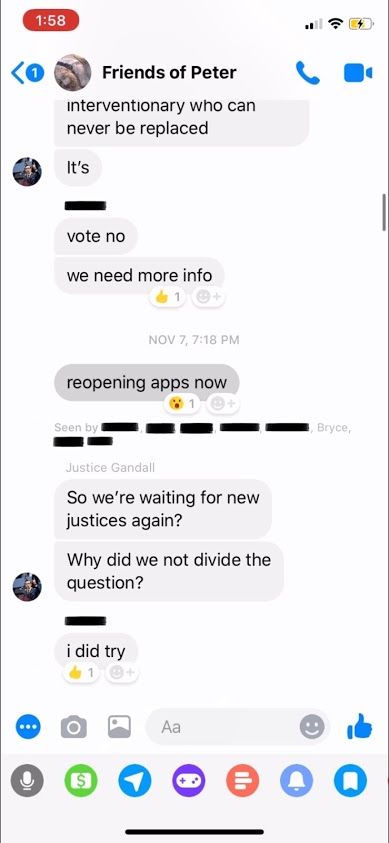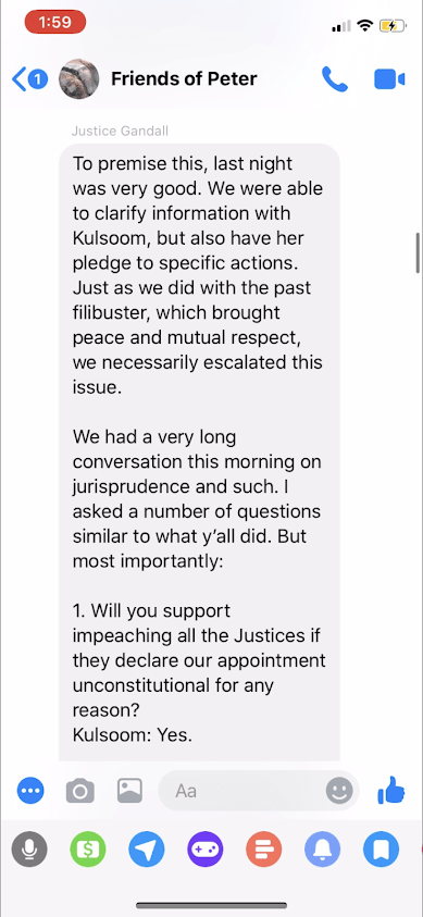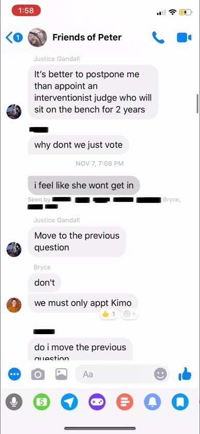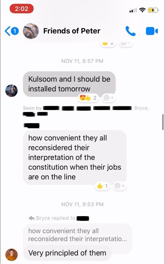 That evening, one of the Friends of Peter group members sent a message showing an email that said that the Judicial Board had instead affirmed the legislation. Gandall then said that he and Naqvi were “judges now.”