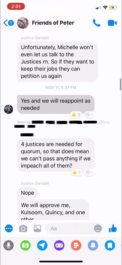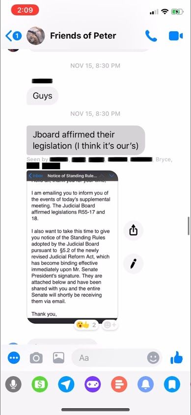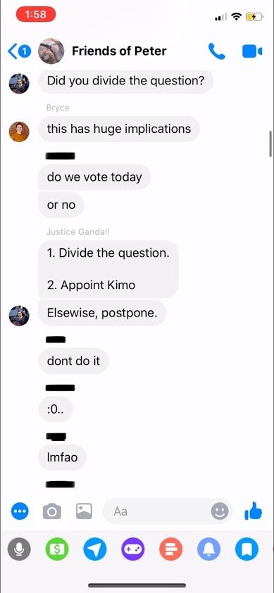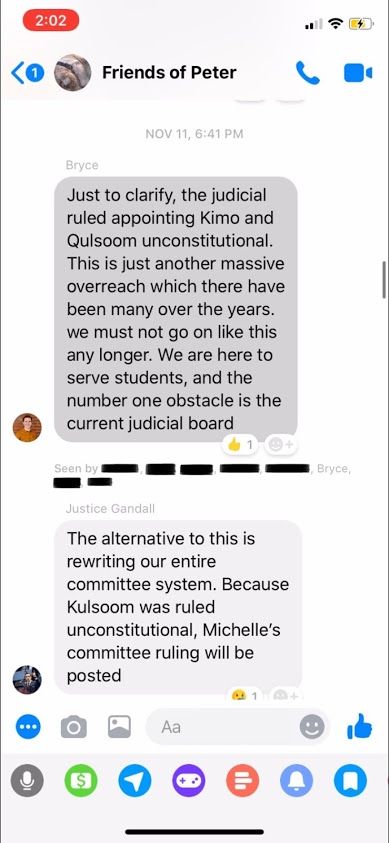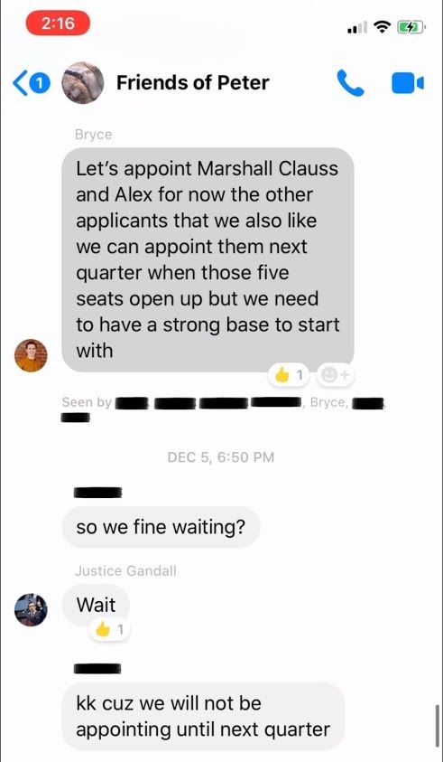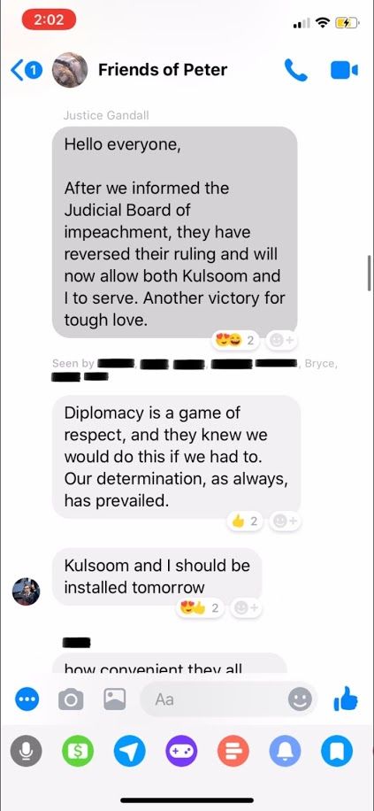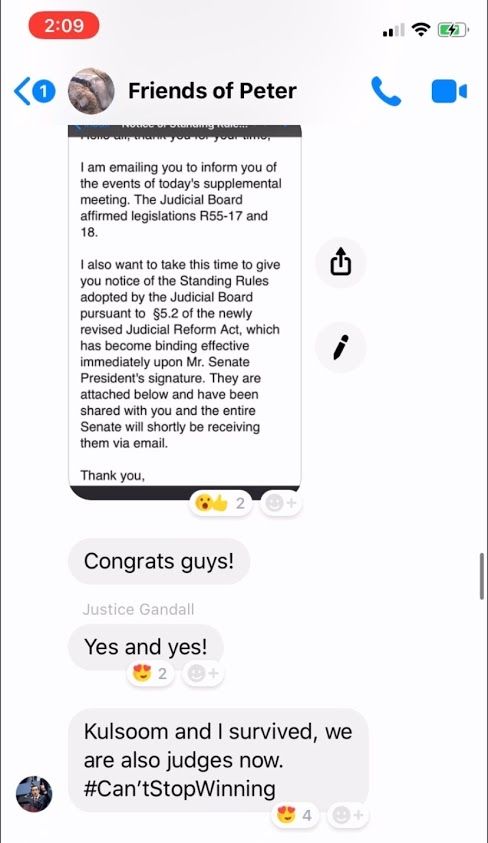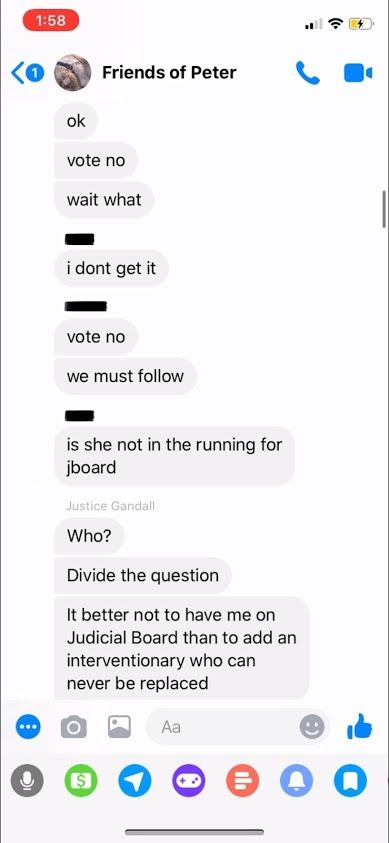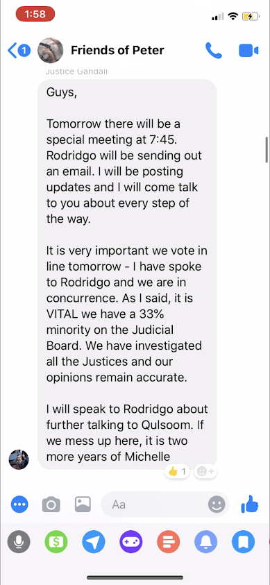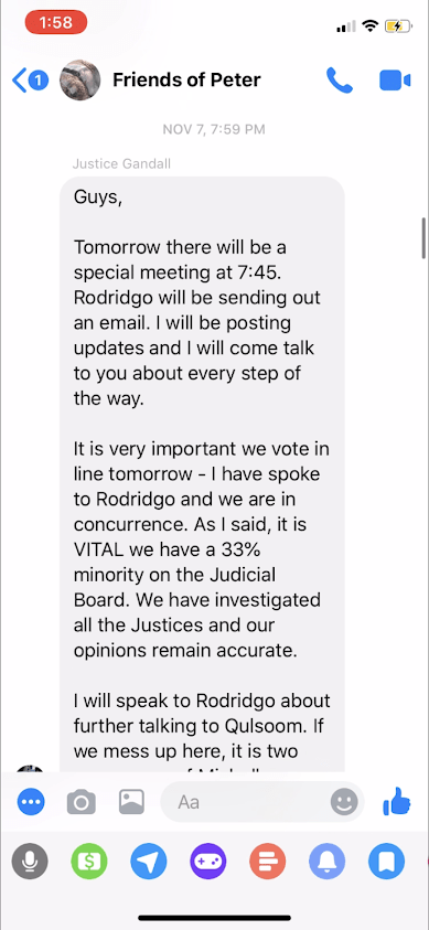 Quintas and Gandall then informed the Judicial Board of the impeachment plans. According to Gandall’s messages, the Judicial Board reversed their ruling on legislation R55-17. Lindsey sent messages to the Friends of Peter group chat supporting the impeachment and referring to the Judicial Board as “the number one obstacle.”