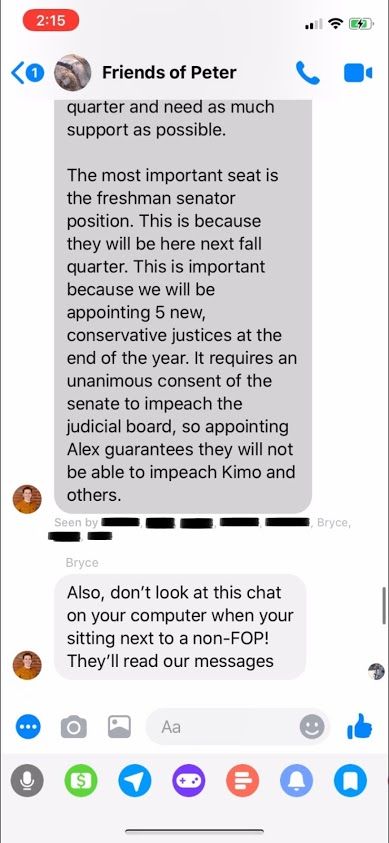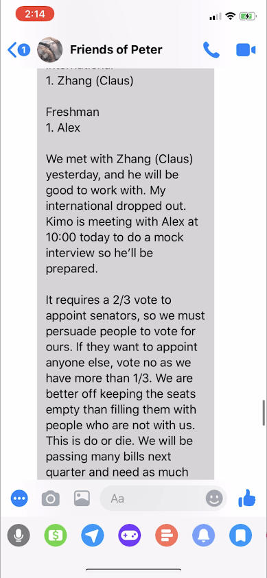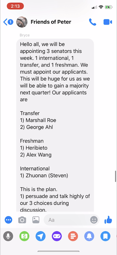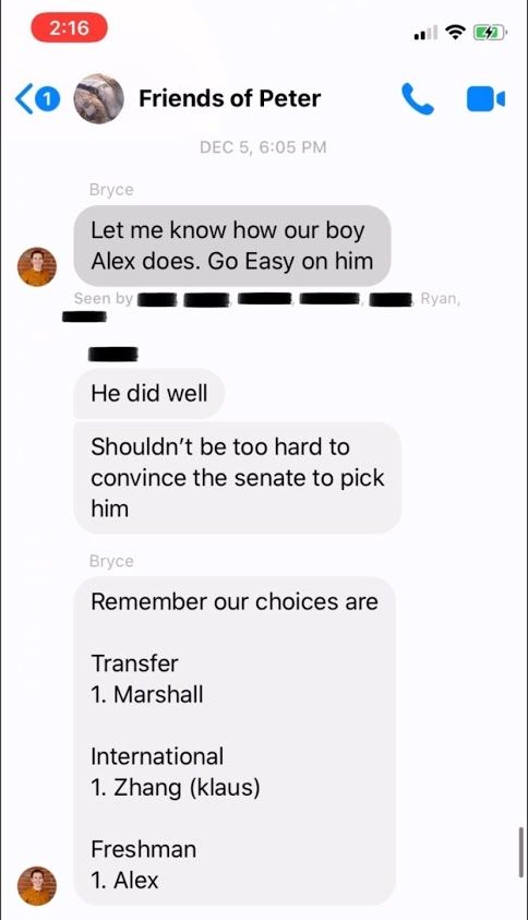 However, after Lindsey said who the Friends of Peter group chat should vote in favor of for transfer senator, international senator and freshman senator, Lindsey told the group members to “go easy on” their preferred candidate for freshman senator, Alex Wang. No other similar comments were made on the group chat for other candidates, including their other preferred candidates.