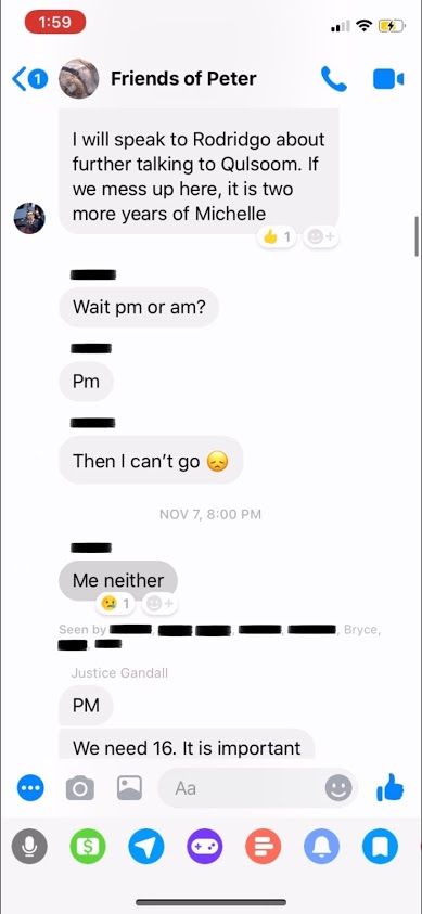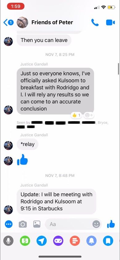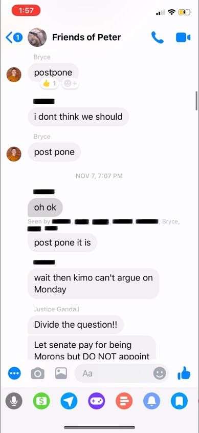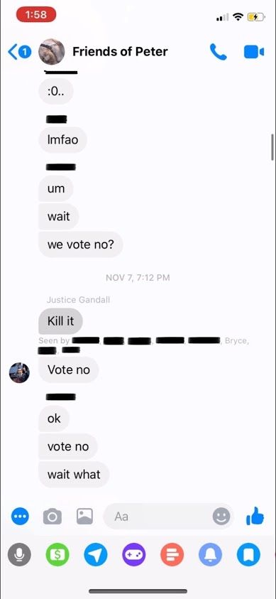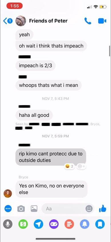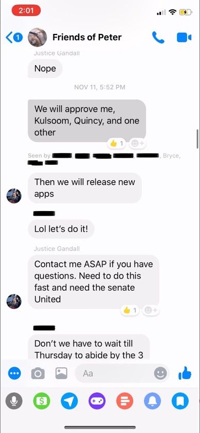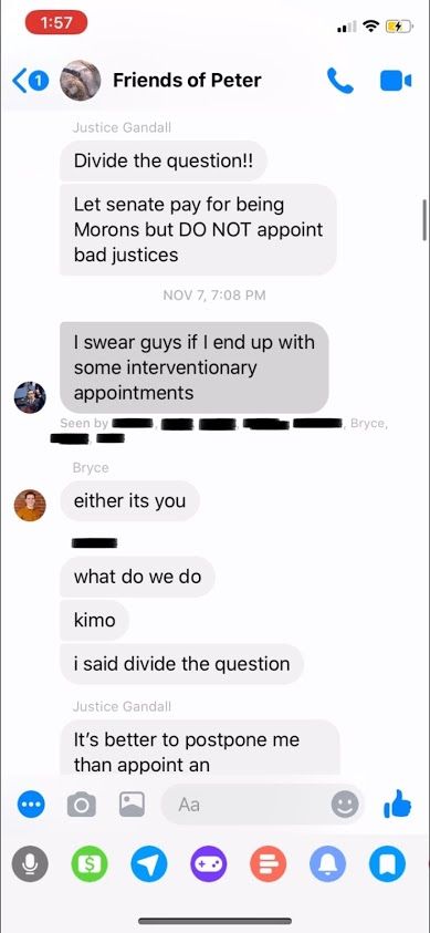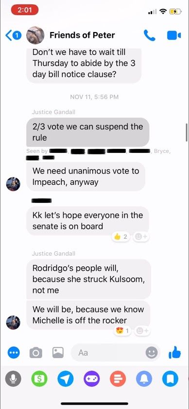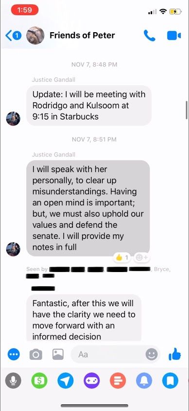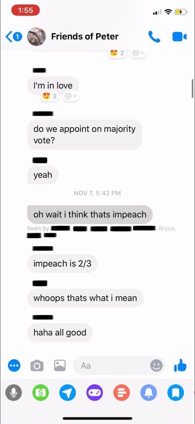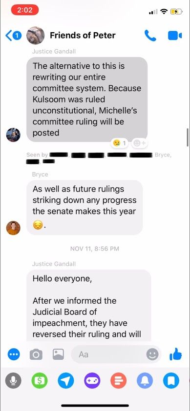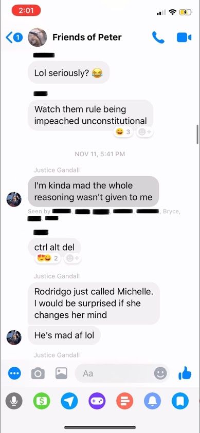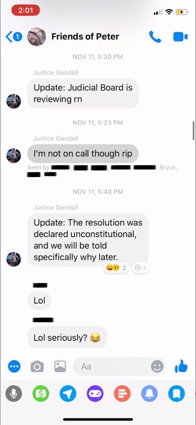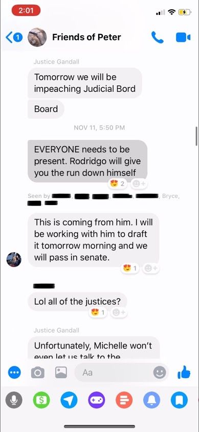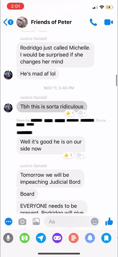 After Gandall informed the Friends of Peter group chat that legislation R55-17 was declared unconstitutional (according to Abundis, it was actually tabled, rather than declared unconstitutional), he informed the other group members that “we [they] will be impeaching Judicial Board” in the next senate meeting on Nov. 12 and that the group members all needed to be present during the meeting. Gandall said that he would help Quintas write the legislation for impeachment.