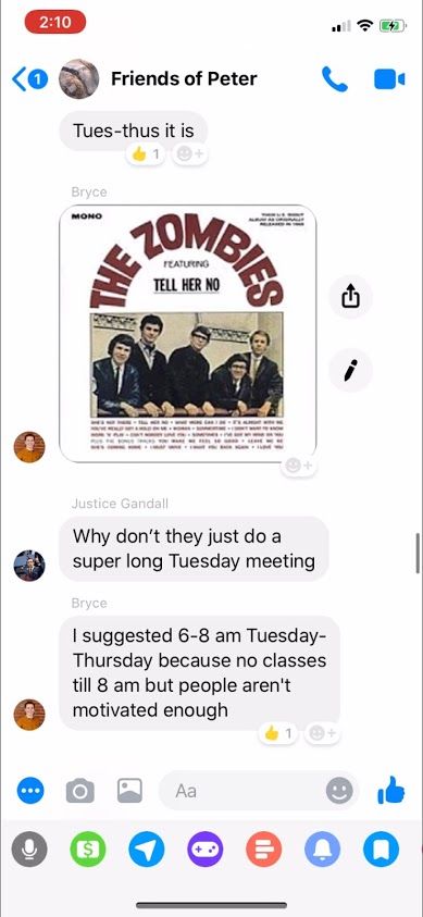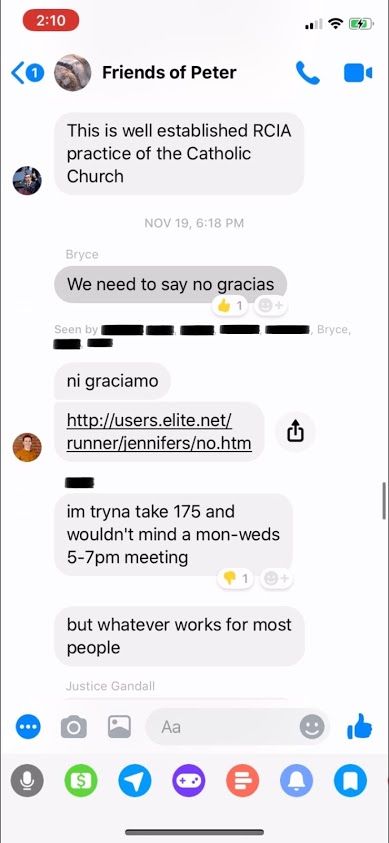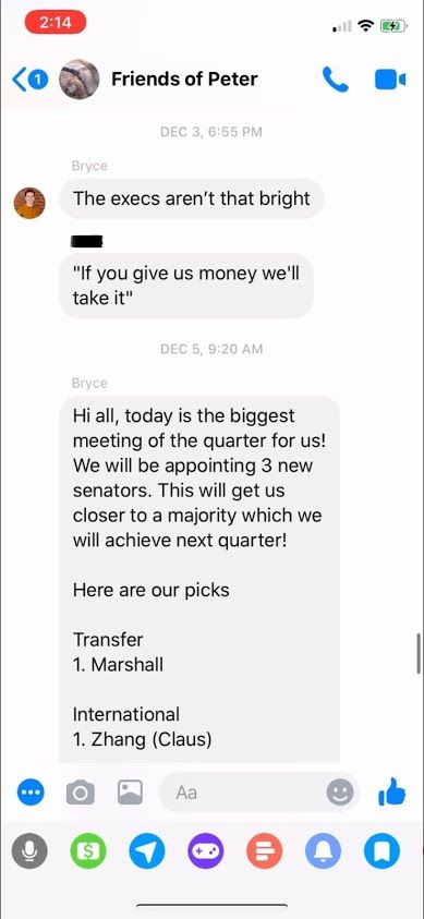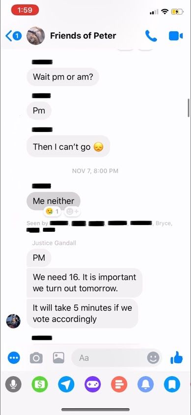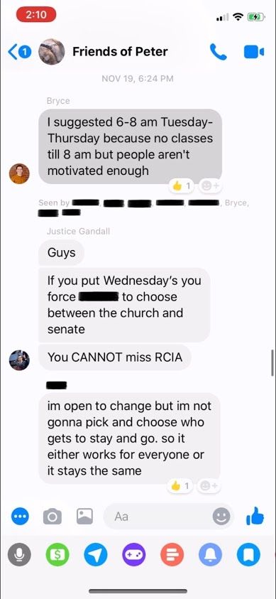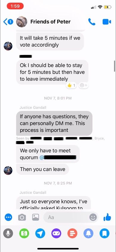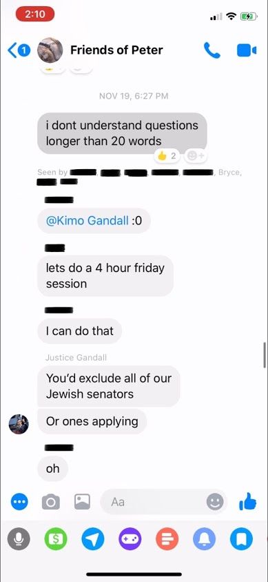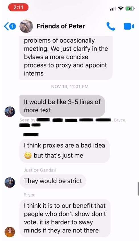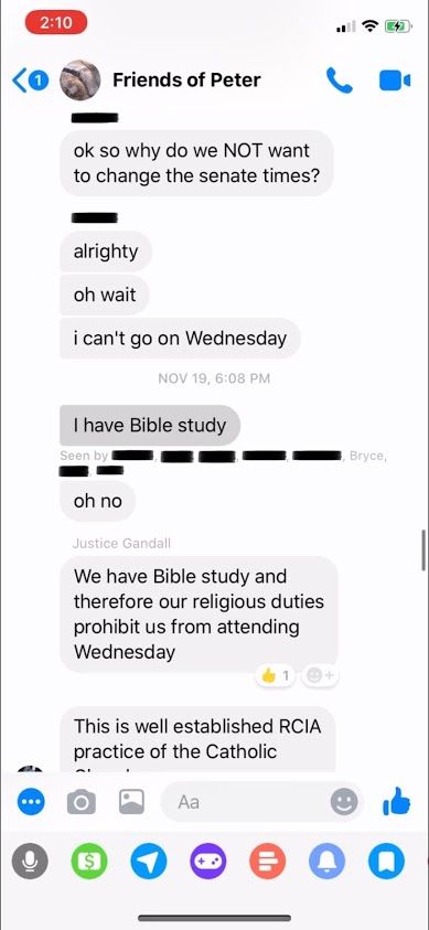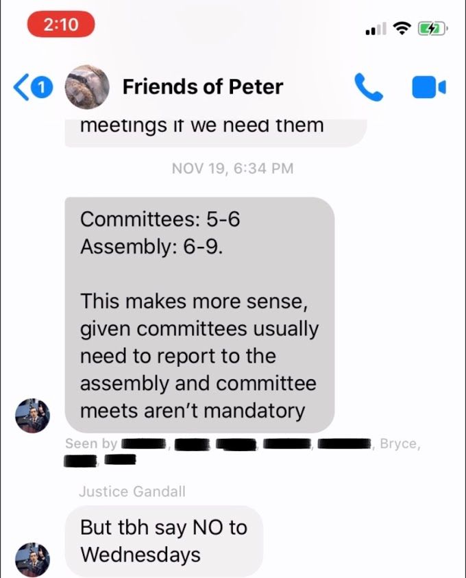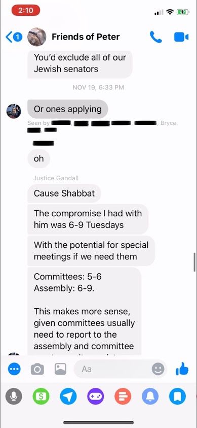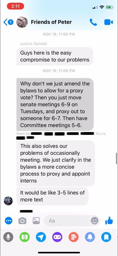 Gandall said in the Friends of Peter group chat that he did not want senate meetings to be held on Wednesdays because he and a senator who is also a Friends of Peter member could not attend those meetings due to religious conflicts. He then said that meetings could be held on Tuesdays and then suggested “we [they] just amend the bylaws” to allow proxy votes.