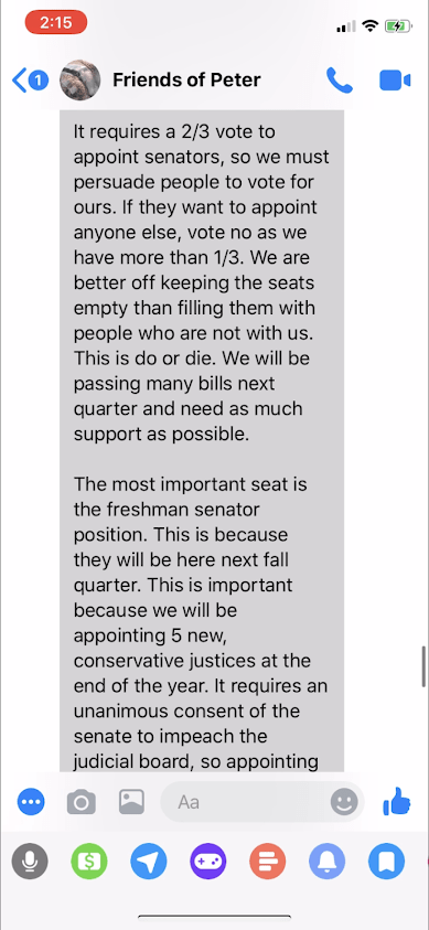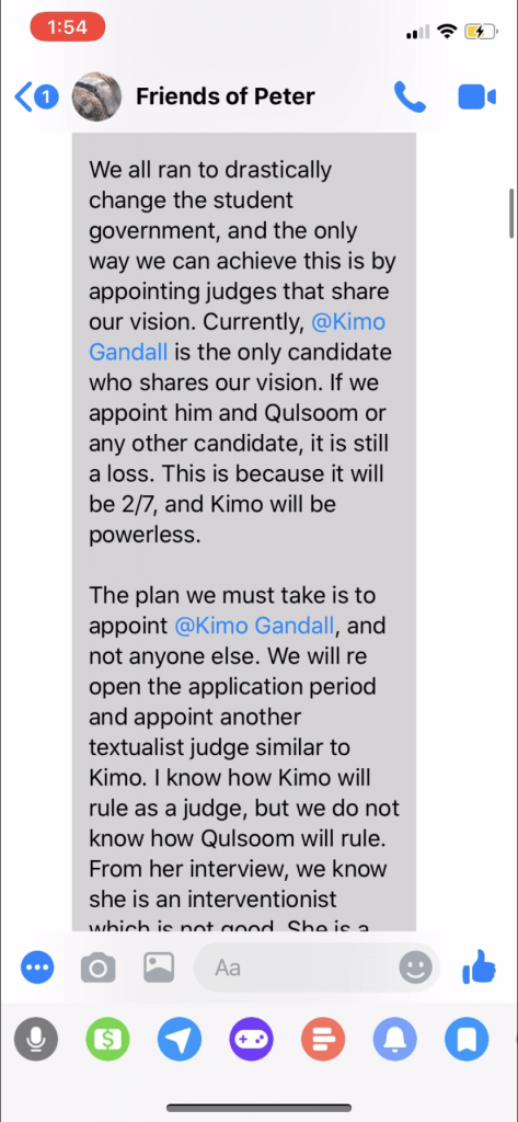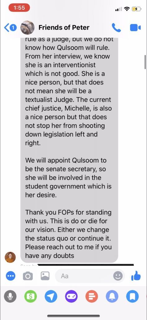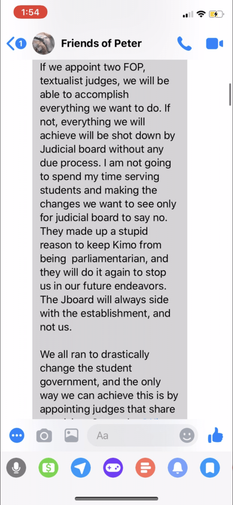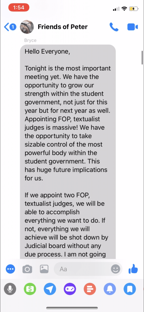 Prior to the the Nov. 7 meeting in which then-Senate President Rodrigo Quintas introduced Legislation R55-17 to appoint Kimo Gandall and Kulsoom Naqvi as the two new Judicial Board Associate Justices, Lindsey sent a message to the Friends of Peter group chat an hour before the meeting to tell group members that if they appointed “FOP, textualist judges,” they — as in, Friends of Peter — would “have the opportunity to take sizable control of the most powerful body within the student government [the Judicial Board].” Lindsey directed the group to only appoint Kimo to ensure that he had decision-making power.