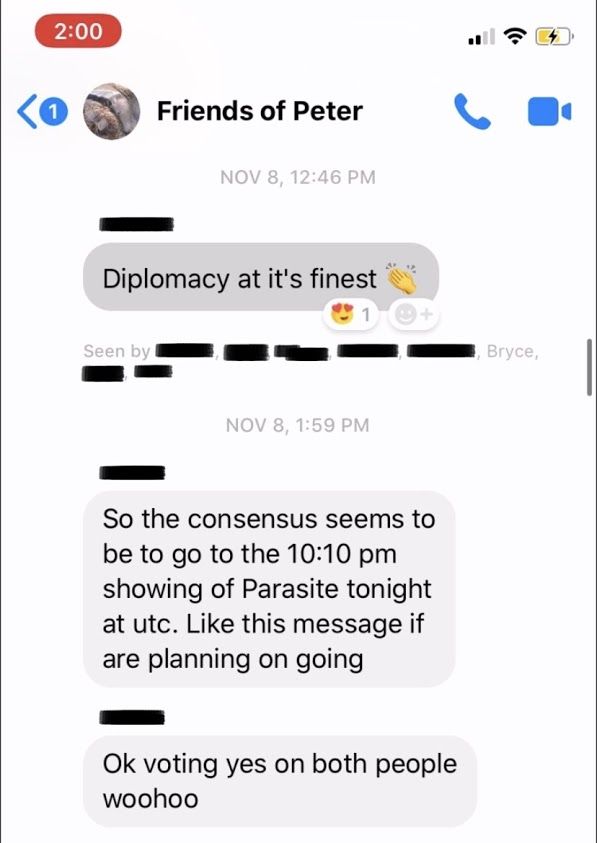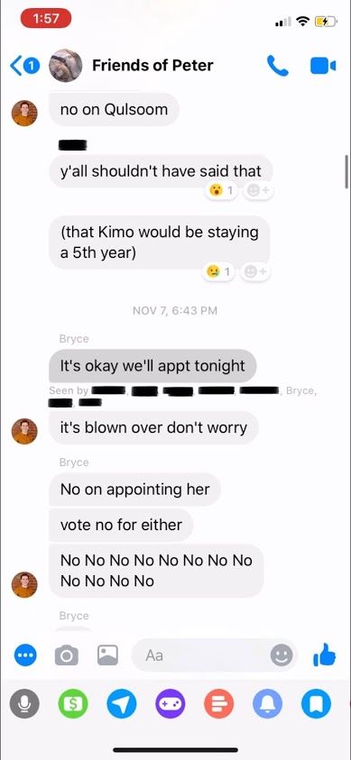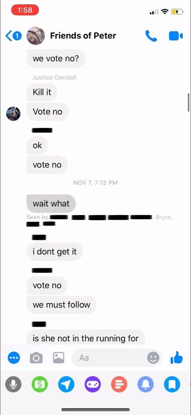 The following screenshots come from the Friends of Peter group chat that Lindsey and Gandall were a part of, along with ASUCI At-Large Senator Gabriela Gallardo, At-Large Senator Joshua Wolfe, At-Large Senator Tammy Dang, Engineering Senator Ryan Salatti, Humanities Senator Amanda Clark, Social Science Senator Juliana Chhouk, Social Sciences Senator Logan Knight, Biological Sciences Senator Luke Tomlinson and former At-Large Senator Brandi Borba. Gandall and Borba left the group chat on Dec. 6.