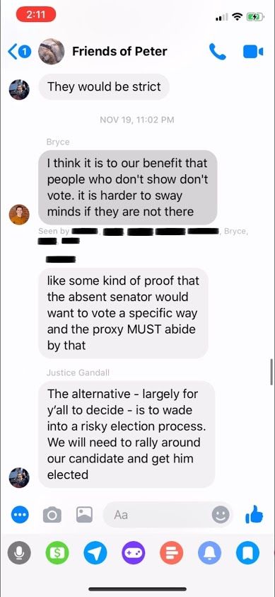 After members of the group chat mentioned issues with proxy votes — including Lindsey, who said that it was beneficial that “people who don’t show don’t vote” —, Gandall told the group chat that they could get involved in a “risky election process.” For which, Gandall said, they would need to “rally around” their candidate for Senate President.
