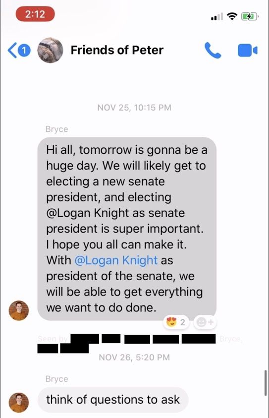 Social Science Senator Logan Knight said that he was planning on “taking up” the Senate President role. Lindsey supported Knight and, on Nov. 25, told the group chat that if Knight was elected, “we [Friends of Peter] will be able to get everything we [Friends of Peter] want done.”