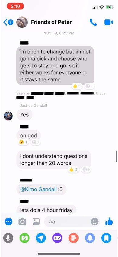 For privacy and confidentiality reasons, the New University will only show which messages come from Lindsey and Gandall, other members’ names have been redacted. Exceptions are made when names need to be shown for context.