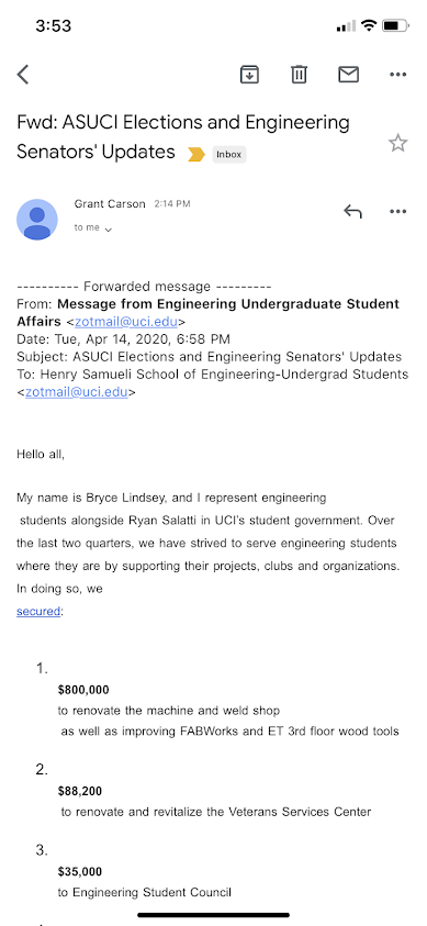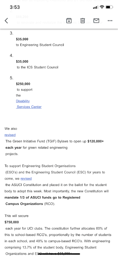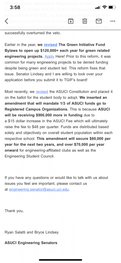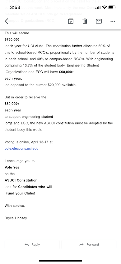 The email — written by Lindsey — told the students that the new ASUCI Constitution would secure $750,000 for UCI Clubs and that the new constitution needed to pass for engineering organizations and the Engineering Student Council to receive $60,000.