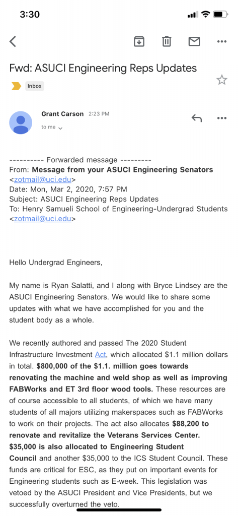 “I asked for the email to be sent through ENGRnews, not through zotmail. The prior engineering-wide email we [the ASUCI Engineering Senators] sent was through ENGRnews,” Lindsey said.