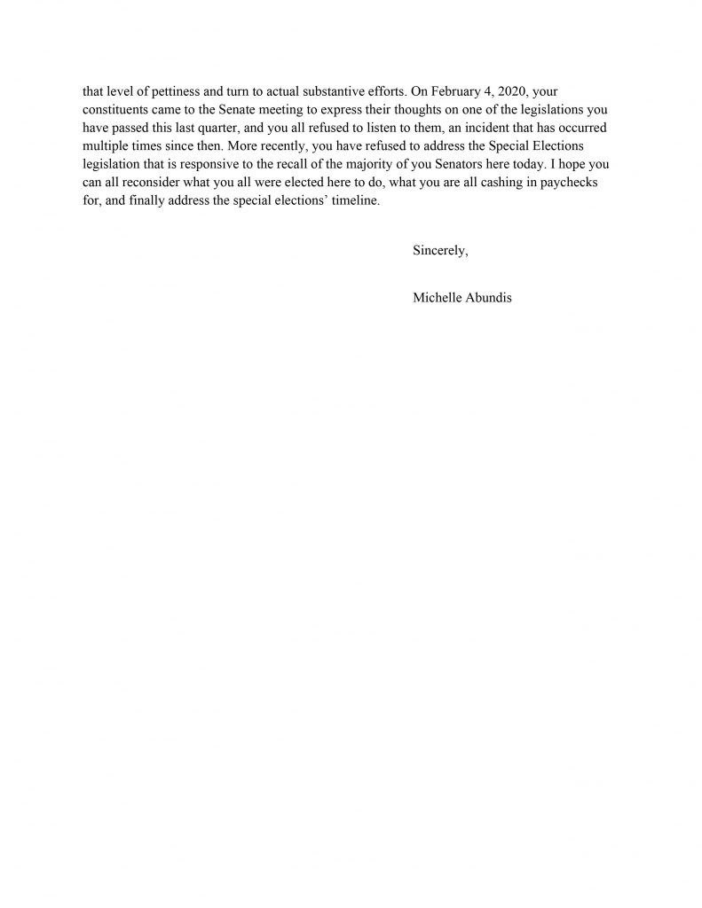 “The ASUCI Senate has become a forum for individuals to avoid facing consequences of their actions,” Abundis said in her letter.