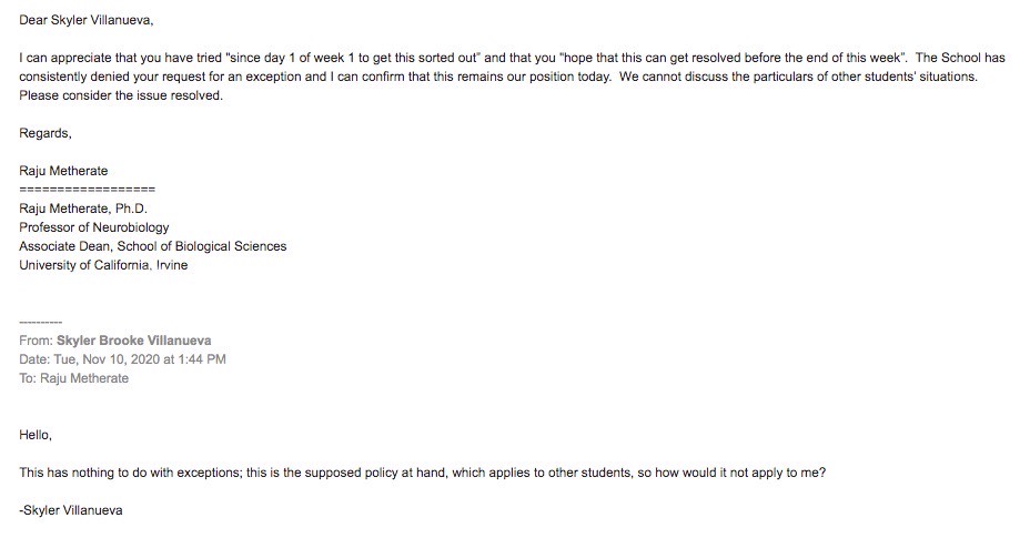 This response was the only email included in Villanueva’s “Part one” video and became one of the main points behind her argument that UCI Bio Sci simply does not care about their students.
