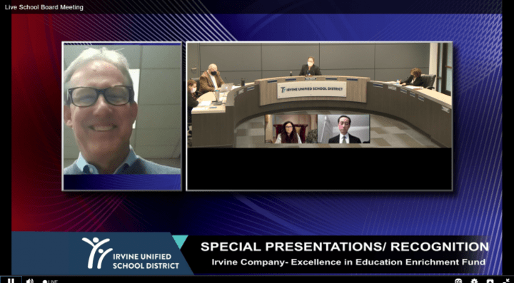This year, Irvine Co. Vice President Jeffrey Davis presented the check during the IUSD’s first Board of Education meeting of 2021.