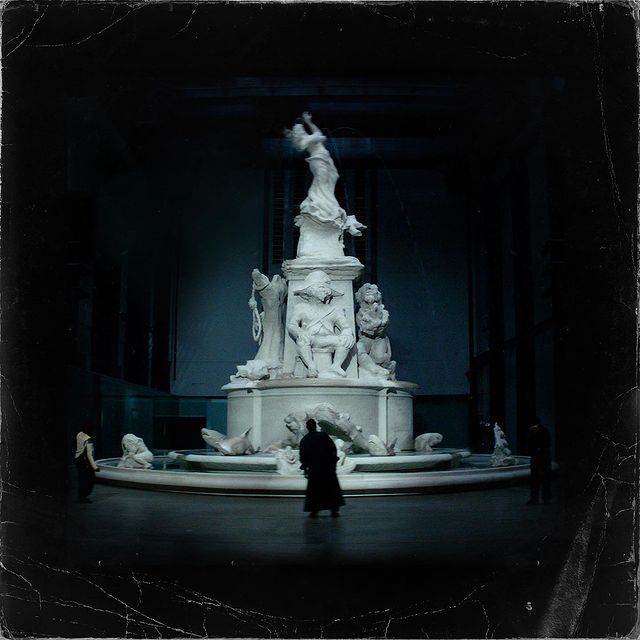 This scene is intercut with another scene of a dark concrete room, with flickering fluorescent lights. Walker’s fountain “Fons Americanus” sits in the center of this almost pitch-black space, surrounded by limp bodies that slowly come to life to the beat of the song.