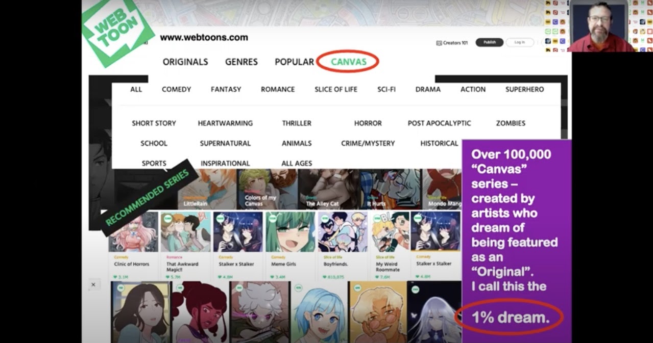 One of Webtoon’s features, CANVAS, was also covered by Yecies in the webinar. CANVAS is a section of Webtoon that allows anyone with an account to post and create their own webtoons for others to see. Webtoon’s “Original” page focuses on webcomics that are either made by the company themselves or by other users whose popularity skyrocketed; enough to where they could make money for their artwork.