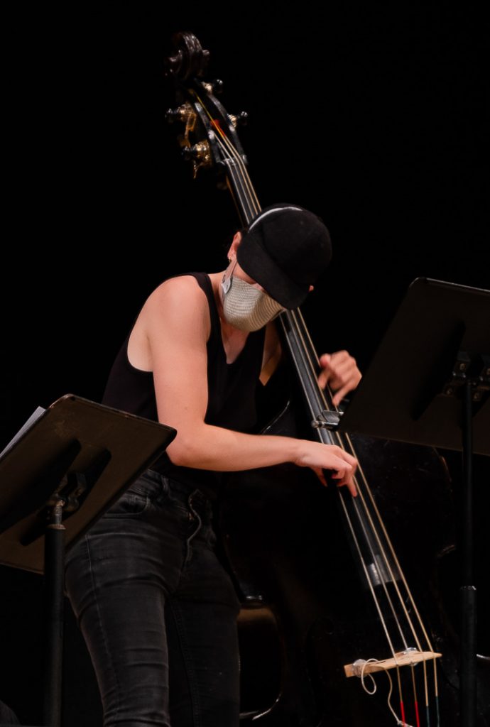 According to Kidambi, their first piece of the evening, “Third Space,” was written in response to the killing of Asian women that occurred in Atlanta, Georgia earlier this year and grapples with Kidambi’s own relationship with an Asian identity in the face of white male nationalism. The group’s collective dynamic instrumentation gives way to feelings of anger, disbelief and melancholy as Kidambi’s voice rises above Nelson’s wavered soprano sax and Lawitts’s heavy bass layer.
