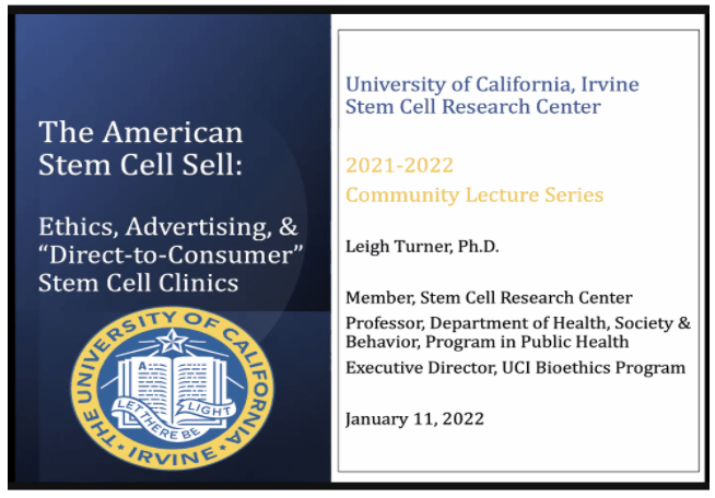 The UCI Sue and Bill Gross Stem Cell Research Center welcomed Dr. Leigh Turner, a professor in the Department of Health, Society, and Behavior at UCI, for a virtual webinar on ethics and regenerative medicine clinics on Jan. 11. In this webinar, Turner discussed the existence of unlicensed stem cell treatment clinics and how marketing tactics utilized by these businesses impact individuals who decide to undergo particular treatments in a significant way.
