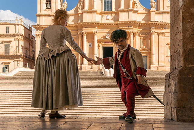 Cyrano de Bergerac (Peter Dinklage) finds himself hindered in pursuing the woman he loves, though this version of “Cyrano” finds him hesitant, not over an especially large nose, but rather an undersized stature. In the story, he writes her romantic letters under the name of a man she believes is her true love. Dinklage is heartbreaking in this role, with longing etched in every part of his face as he looks at his love Roxanne (Haley Bennett). His enunciated delivery of each line leaves the audience breathless, and translates to his impressive singing during the film. Dinklage comes across wonderfully as a star-crossed lover, as well as an accomplished swordsman in fight sequences highlighted by sporadic camera movements and precise lighting. Overall, Cyrano is shown to be eloquent and daring, except when it comes to confessing his love.