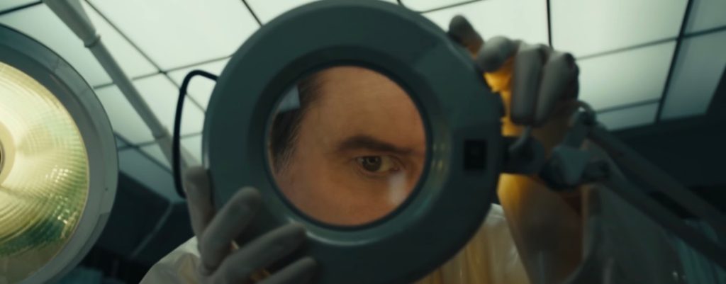 After menacing shots of a bloody champagne bucket and a surgical room towards the end of the music video, an elderly version of The Weeknd wakes up in an operating room to find Carrey placing a mask on his face.