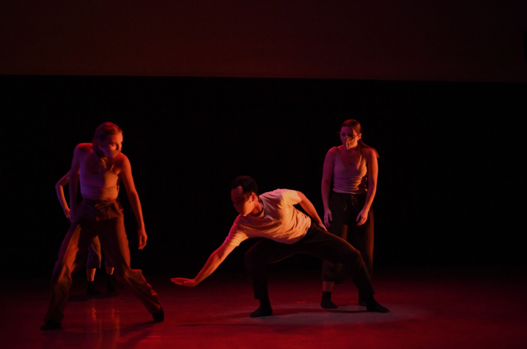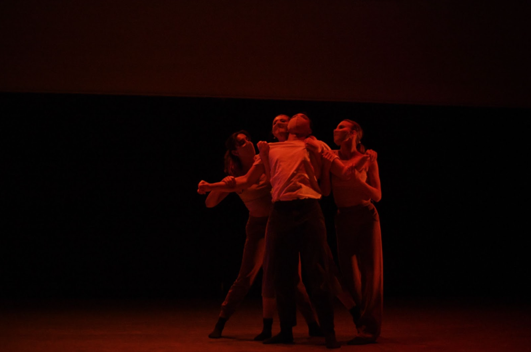 Disrupting the stage’s darkness, a low light slowly illuminates five dancers all wearing brown pants and neutral-colored tops. The first dancer comes from downstage right — her body pushing and pulling towards the audience in a pray-like manner. Then, two dancers emerge from the center stage. Though their physicality initially appears connected and synced, they begin dancing away from each other in a circular motion as two other dancers step into the light, one from upstage and the other from stage left.