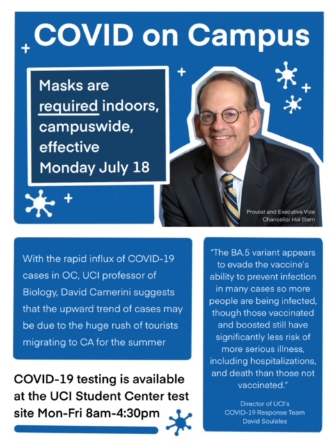 UCI Provost and Executive Vice Chancellor Hal Stern sent an email on Friday, July 15, announcing that masks would be required indoors, campuswide, effective July 18.