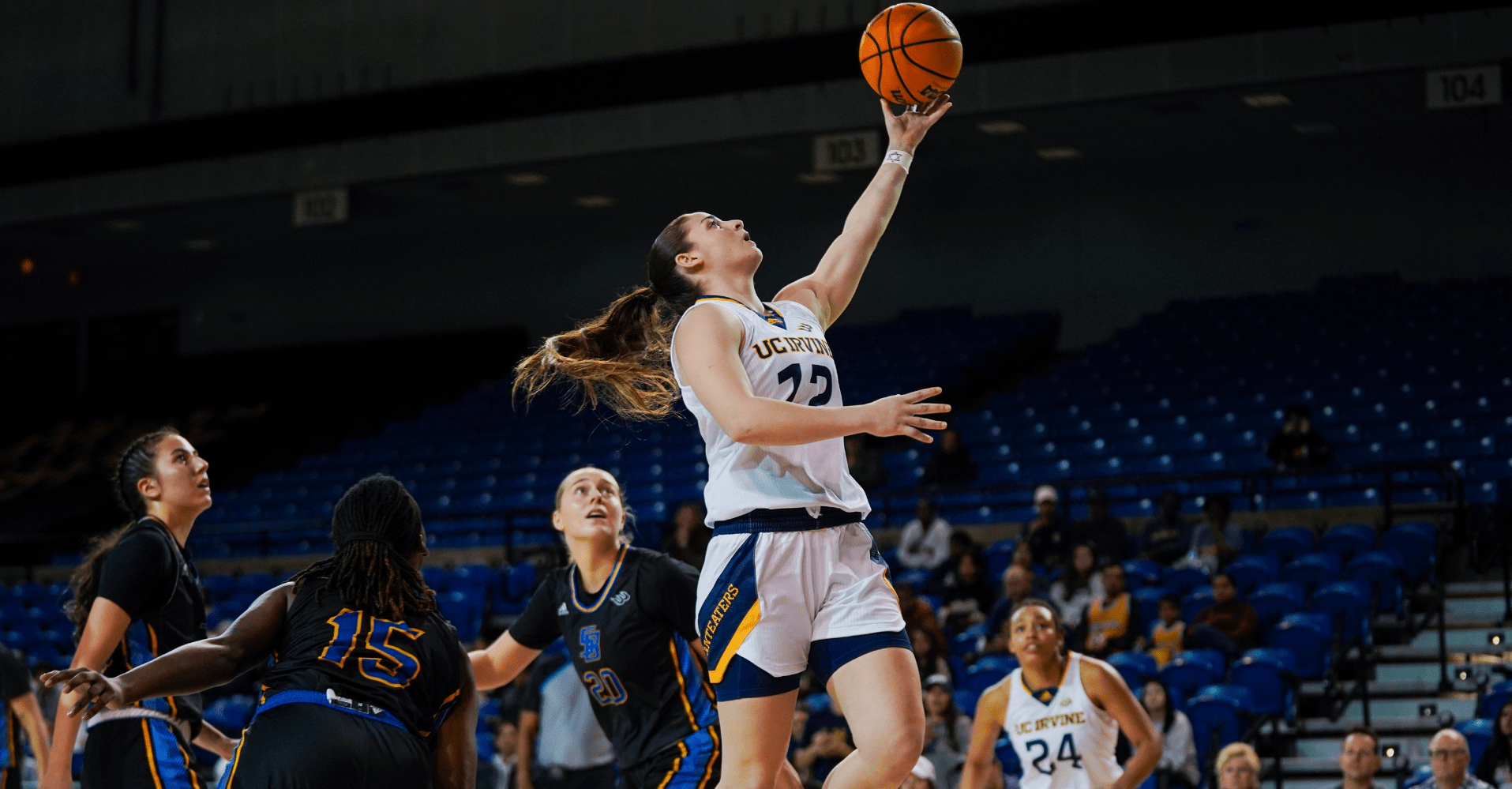 The Anteaters sustained their quick start, turning a missed Gauchos three-pointer into a fastbreak layup for junior guard Amelia Scharpf. Heading into the media timeout, the Anteaters held an early 6-0 advantage.