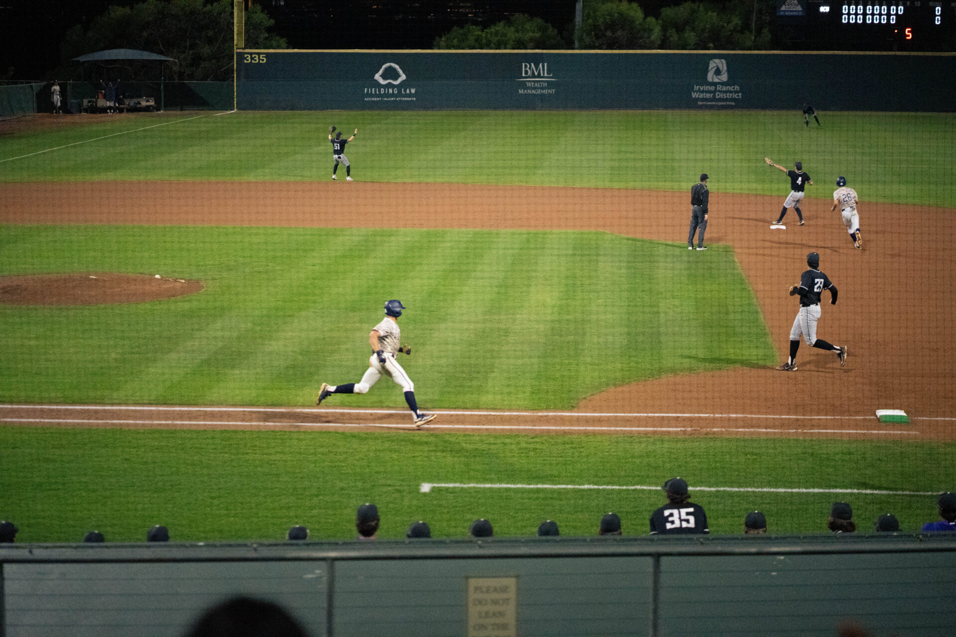 With one out, Irvine’s senior outfielder Rowan Felsch struck out for the second out, but in a confused frenzy, Fjelstad stepped off third base toward the dugout, prompting Perez to throw to Sanko at third. Fjelstad was caught in a pickle, but successfully stole home with no one covering and was called safe to score the Anteaters’ third run of the game.